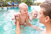 Babyschwimmen: Zusammen mit Mama oder Papa das Element Wasser genießen.